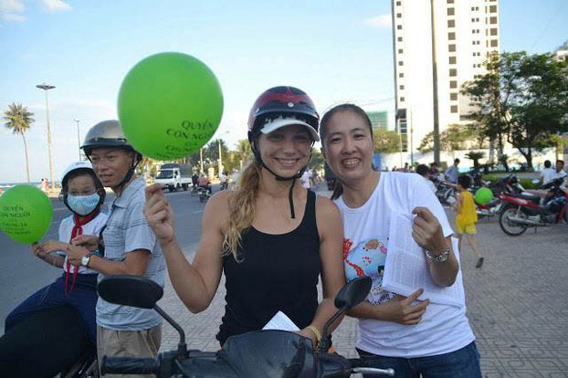 Nguyễn Ngọc Như Quỳnh phát Bản Tuyên Ngôn Quốc tế Nhân quyền và bóng bay ghi dòng chữ ‘Quyền của con người phải được tôn trọng’ ở Nha Trang hôm 21/5/2013. Photo courtesy of Nguyen Ngoc Nhu Quynh